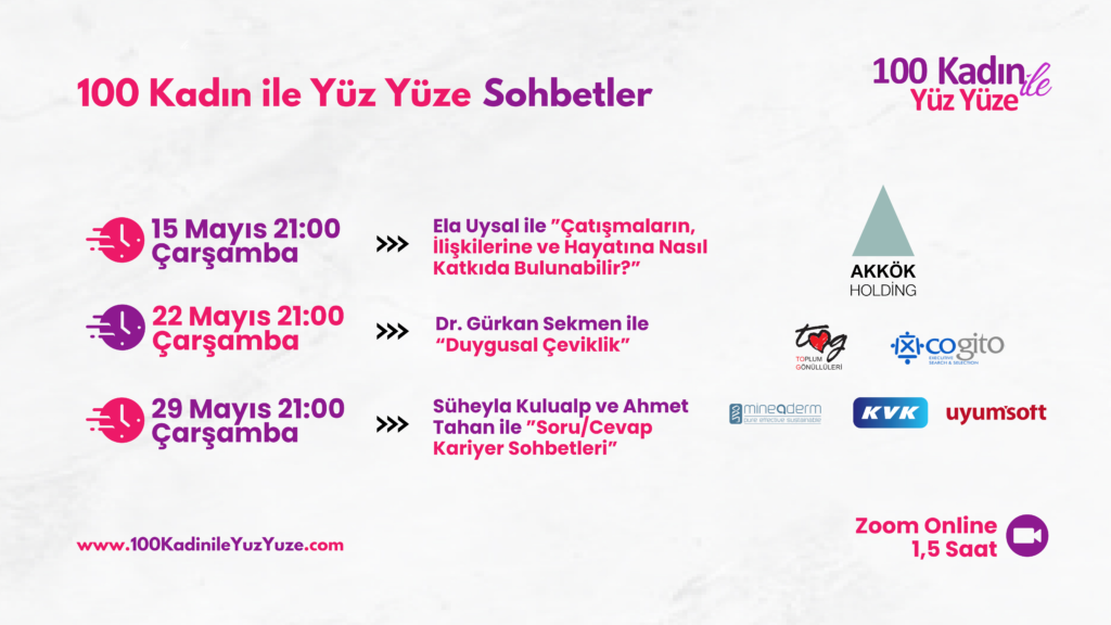 Bu Mayıs ayında, “100 Kadın ile Yüz Yüze” projesi kapsamında düzenlediğimiz üç özel webinar serisine sizleri davet ediyoruz. Her çarşamba akşamı saat 21:00’de gerçekleşecek bu webinarlar, kadınların kariyer ve kişisel gelişim yolculuklarında karşılaştıkları zorlukları ele alacak ve onlara ilham verici çözümler sunacak.