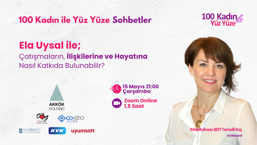 Tüm güçlü #kadınları “100 Kadın ile Yüz Yüze” etkinlik serisinin ilki Ela UYSAL‘ın rehberliğinde; çatışmaları, ilişkilerimizde ve hayatımızda nasıl fırsata dönüştürebileceğimizi keşfetmeye davet ediyoruz.